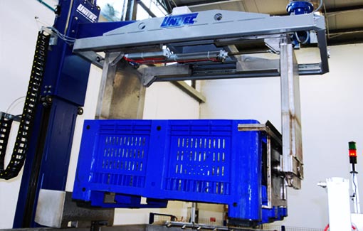 UNI IMM 900 es un sistema extremadamente compacto que requiere mucho menos espacio que los sistemas de vaciado convencionales. El inmersor dispone de una sólida torre sobre carriles con pinza que puede volcar el producto y girar los bins en función de las necesidades y del producto que se está elaborando. El sistema también puede apilar y desapilar un máximo de 3 bins a la perfección. Se trata de un sistema altamente flexible y productivo que resulta fácil de controlar y programar.