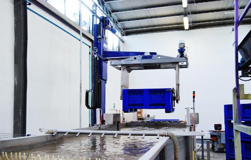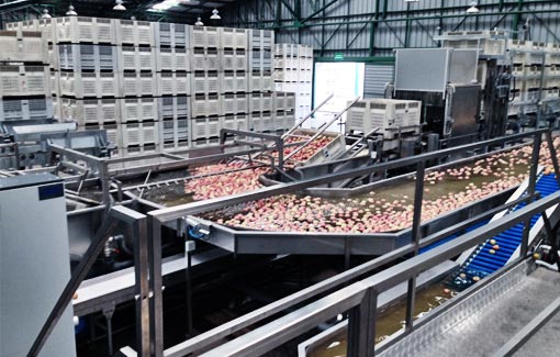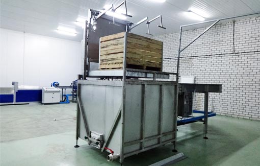 Es el innovador sistema automático de vaciado en agua de los bins para productos que flotan (como las manzanas) y que no flotan (como las peras) e incorpora una función de apilamiento y desapilamiento.